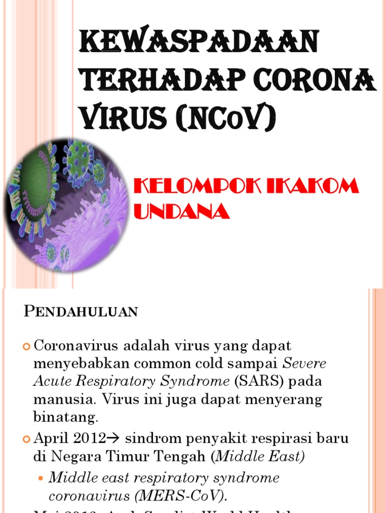 Koronavirus adalah virus dari familia coronaviridae yang dapat menyebabkan penyakit pada manusia mamalia dan burung. Penyakit middle east respiratory syndrome coronavirus mers cov adalah penyakit saluran pernapasan yang disebabkan oleh coronaviruspenyakit ini menular dari unta ke manusia serta dari manusia ke manusia. Coronavirus adalah virus penyebab beberapa penyakit pernapasan.